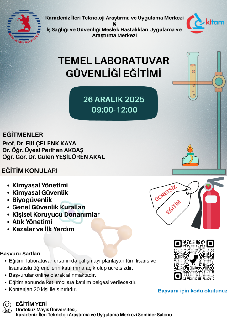 Ondokuz Mayıs Üniversitesi Karadeniz İleri Teknoloji Araştırma ve Uygulama Merkezi (KİTAM) tarafından, üniversitemiz bünyesinde öğrenim gören tüm lisans ve lisansüstü öğrencilere yönelik, 26 Aralık 2025 tarihinde Ücretsiz Laboratuvar Güvenliği Eğitimi düzenlenecektir.
